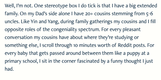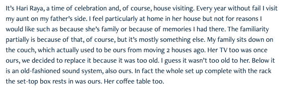 Dia mulakan karangannya dengan perayaan Hari Raya di mana beliau mengunjungi rumah saudara-maranya. Tapi, dia bangga kerana hampir 90% (agaknya) perkakas di rumah makciknya pernah dimiliki keluarganya satu ketika dahulu.