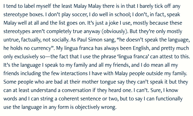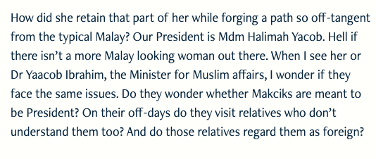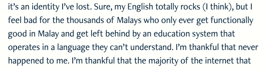 Tapi kesianlah, ramai orang di Singapura berdwibahasa, yang kau tu, nak sebut ayat Melayu terkial-kial? Ini bermaksud, ramai Melayu yang lagi bijak berbanding kau sebab mereka memahami dua tatabahasa. Kau (mungkin) satu aje.