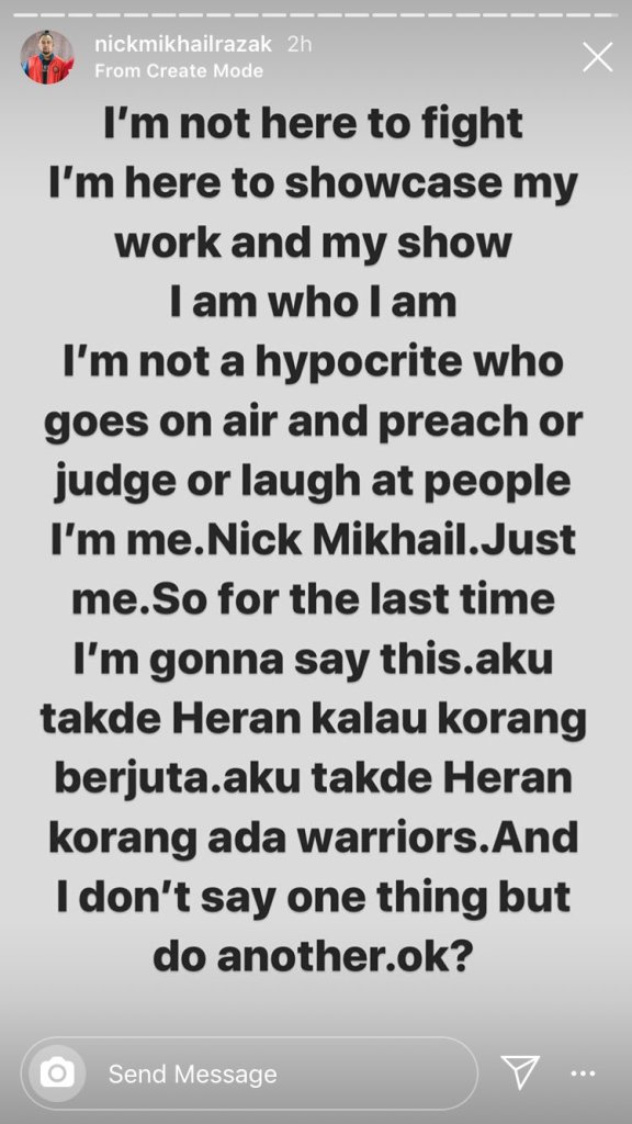 Aku bukan di sini untuk bergaduh. Aku di sini untuk pamerkan kerja aku dan tunjukkan siapa diri aku. Aku bukan hipokrit di mana aku ke udara dan berhujah atau ketawakan orang. Aku adalah aku. Nick Mikhail. Hanya aku. Jadi untuk kali terakhir aku akan katakan ini. Aku tidak heran kalau korang berjuta. Aku takde heran korang ada pahlawan. Dan aku tak cakap satu benda dan lakukan perkara lain. Ok?