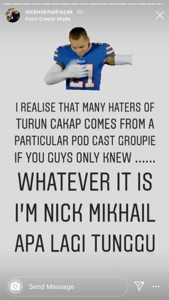 Baru-baru ini, Nick Mikhail ada mengongsikan gambar di Instagram Storynya (@nickmikhailrazak) yang memberi bayangan bahawa terdapat sekelompok puak manusia yang membawang tentang saluran YouTubenya, Turun Cakap!