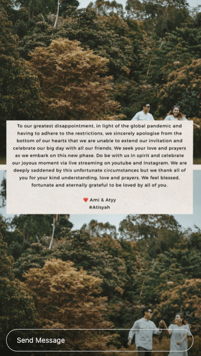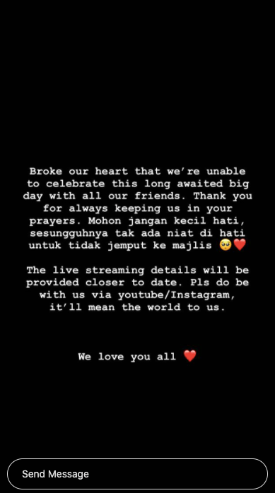Menjelas di IG Storynya, Atyy berkata bahawa mereka sedih bahawa mereka tidak boleh meraikan hari bahagia ini dengan kesemua sahabatnya. Dan memohon agar orang yang tidak dijemput tidak kecil hati. Dan oleh kerana itu, hari istimewa ini ditayangkan di YouTube untuk tatapan ramai.