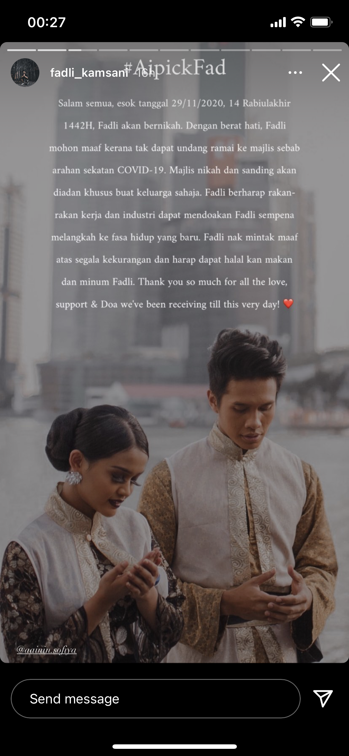 Sehari sebelum itu, Fadli meminta maaf kepada orang ramai di IG Storynya kerana tidak dapat menjemput ramai orang dek Covid.