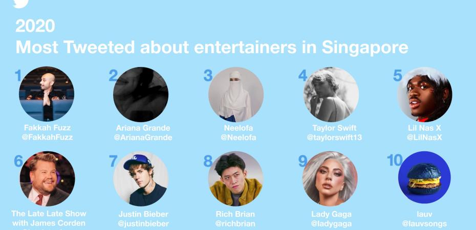 Antara penghibur lain yang turut dalam carta 10 teratas (Most Tweeted about entertainers in Singapore) itu termasuk Neelofa, Ariana Grande, Justin Bieber, James Corden, Lady Gaga, Taylor Swift dan banyak lagi, menurut Twitter.