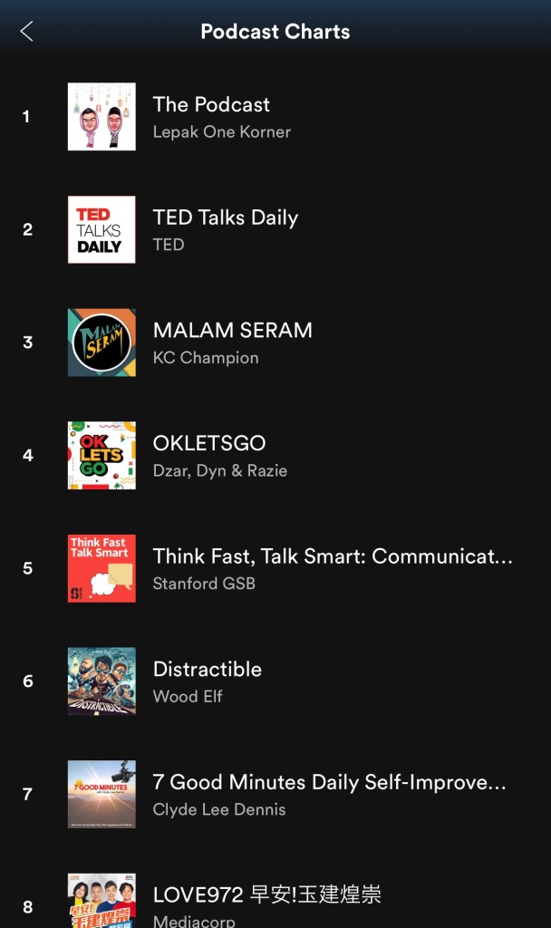 OkLetsGo kini berada di tangga ke-4, manakala Malam Seram di tangga ke-3. Podcast yang pernah berada di tangga pertama, A Mom Us The Podcast kini di tangga ke-20!
