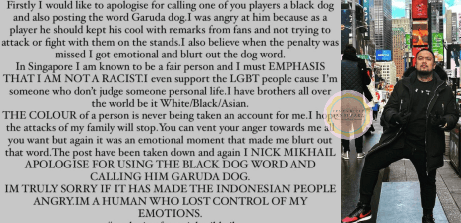 Menurut catatan Instagramnya, Nick Mikhail ingin memohon maaf kepada Indonesia kerana memanggil salah satu pemain bola sepak Indonesia ‘anjing hitam’ dan juga menyiarkan kekata ‘anjing Garuda’.