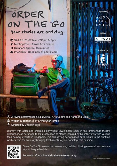 Dalam persembahan ini, Erwin akan menghidupkan kisah-kisah yang diilhamkan oleh wawancaranya bersama penghantar makanan di Singapura.
