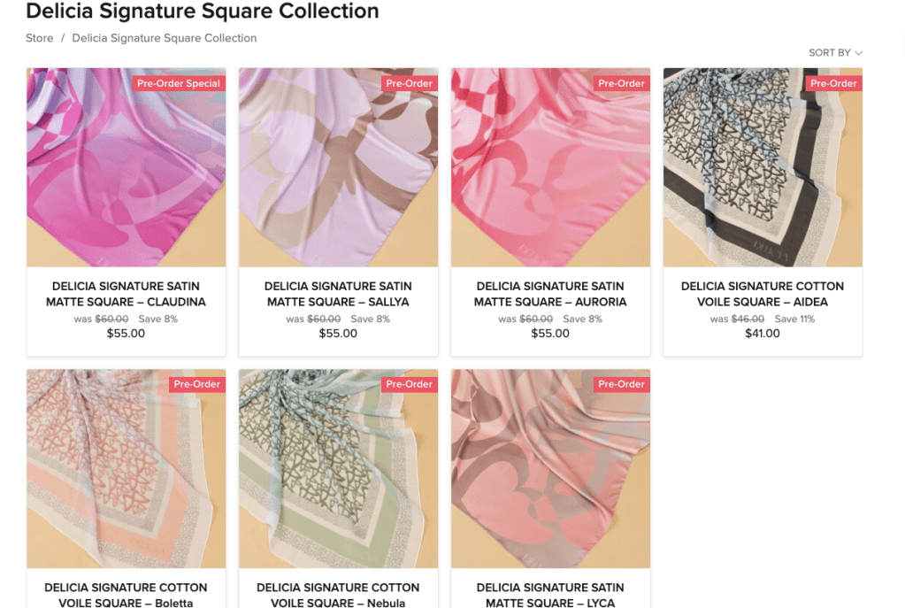 Di lelaman Malaysia Dèlicía, terdapat 7 helai tudung yang boleh anda tempah. Begitu juga di lelaman Singapuranya.