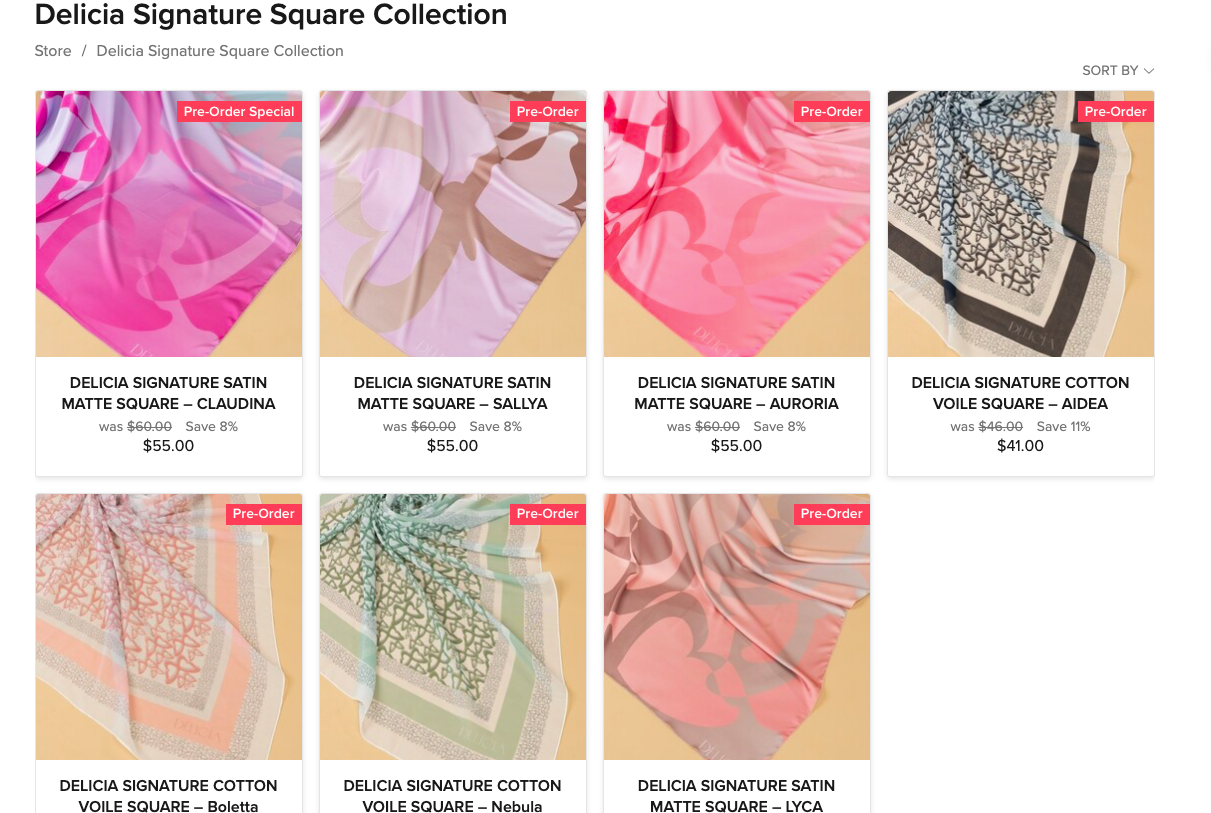 Di lelaman Malaysia Dèlicía, terdapat 7 helai tudung yang boleh anda tempah. Begitu juga di lelaman Singapuranya.