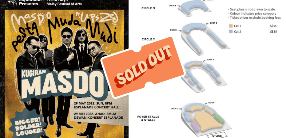 Tiket bagi konsert Kugiran Masdo sold out sekali lagi. Ini setelah pihak Pesta Raya di Esplanade memindahkan ruang panggung konsert ini dari Studio Recital ke Dewan Konsert yang mampu menampung lebih ramai orang.