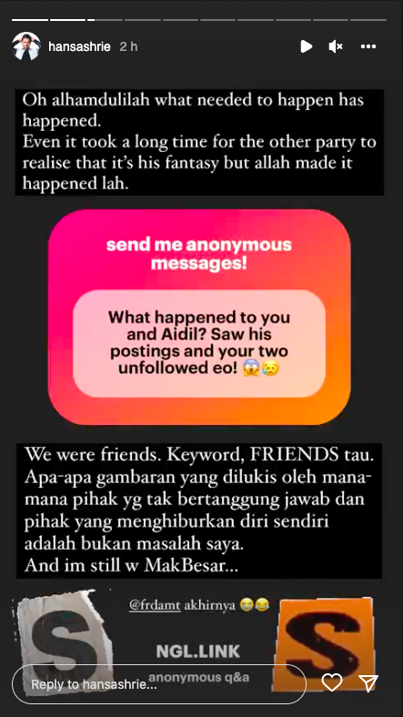 Menurutnya, dia tidak mahu lagi berkaitan dengan Hans Ashrie dan ingin menutup buku. Aidil juga mengakhiri posting itu dengan Al-Fateha.