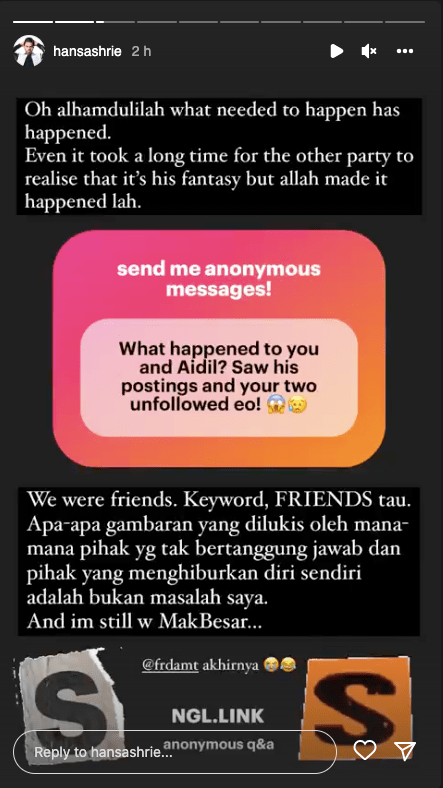 Menerusi pertanyaan di aplikasi hangat lagi sensasi NGL, Aidil mengongsi secebis kisah ini.