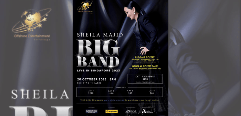 Berjudul SHEILA MAJID BIG BAND LIVE IN SINGAPORE, harga tiket bermula pada $68 hinggalah $248.