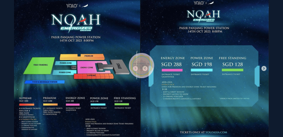 Awal pagi tadi, pihak penganjur, YOLO Singapore, telah mengongsi harga tiket bagi konsert NOAH yang akan berlangsung pada 14 Oktober di Pasir Panjang Power Station.