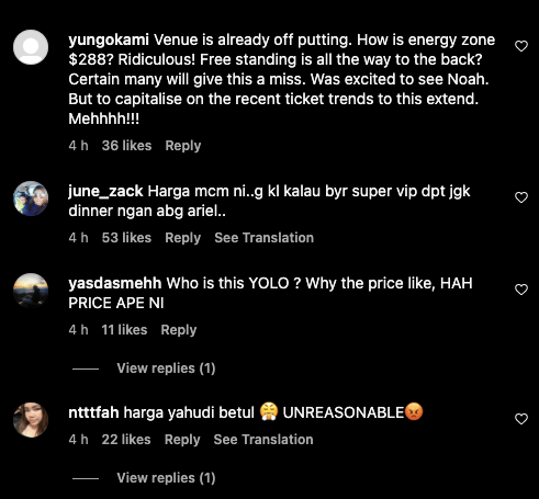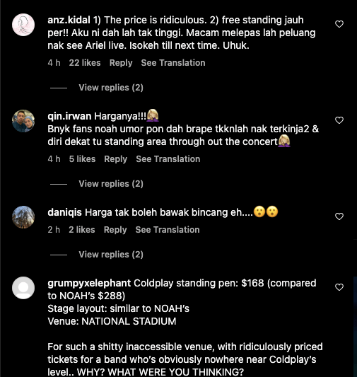 Ramai yang berpendapat bahawa tiket-tiket bagi konsert kumpulan NOAH di Singapura ini terlalu mahal, dan melampaui harga tiket artis-artis antarabangsa seperti Coldplay dan J Balvin.