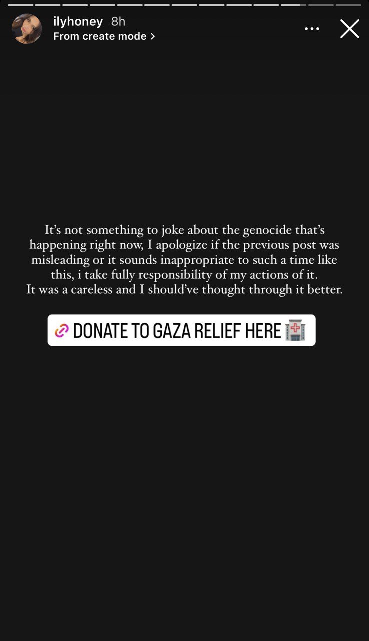 Pempengaruh ILYHONEY telah memohon maaf atas siaran Instagram Storynya baru-baru ini. Kandungan yang dimuatnaikkan oleh bekas peserta ratu cantik itu kurang sensitif akan situasi yang berlaku di Gaza.