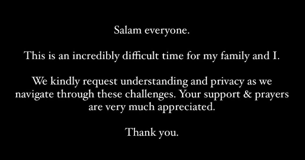 Kami ingin meminta kesefahaman anda dan keperibadian tatkala kami mengemudi cabaran ini. Sokongan dan doa anda amat dihargai”