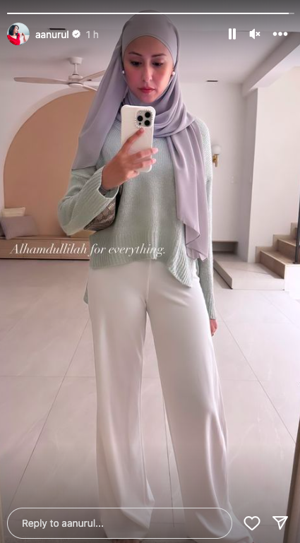 Beberapa jam yang lalu, ibu tiga anak itu memuatnaikkan gambar di IG Storynya, menunjukkan imej berhijabnya, bersertakan kapsyen: