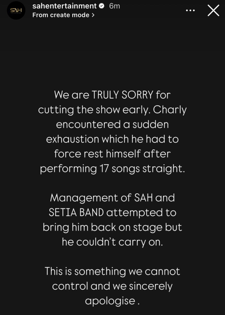 Perkara ini telah disahkan oleh perbualan di saluran Telegram SAH Chat Box yang menyatakan bahawa Charly pitam. Difahamkan juga bahawa durasi konsert disingkatkan.
