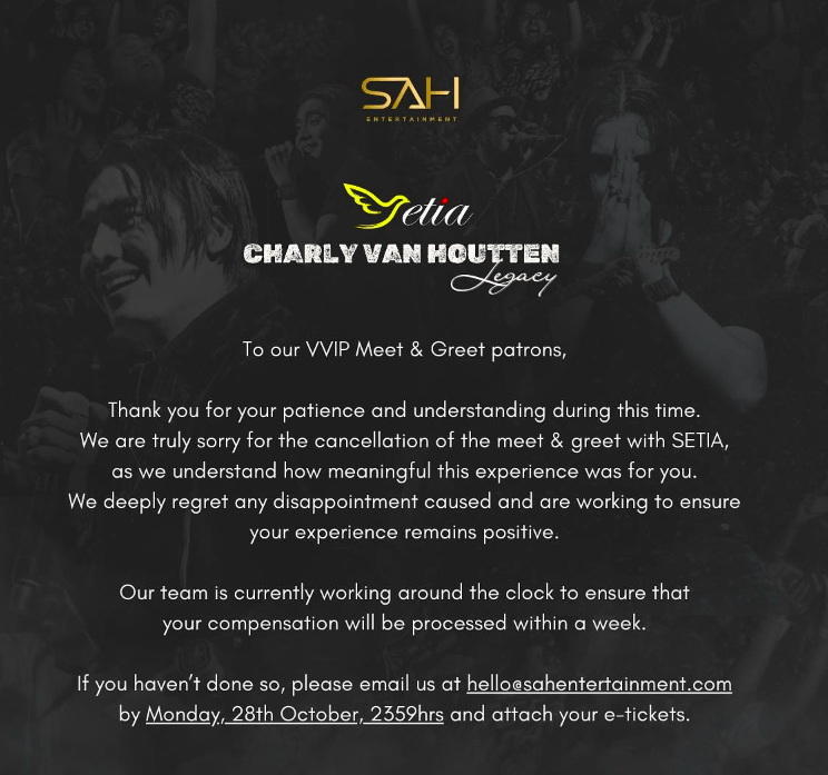 Difahamkan bahawa penyanyi Setia Band, Charly Van Houtten, pitam semasa konsertnya pada Oktober lalu di Bukit Bintang Temasek (Star Theatre).