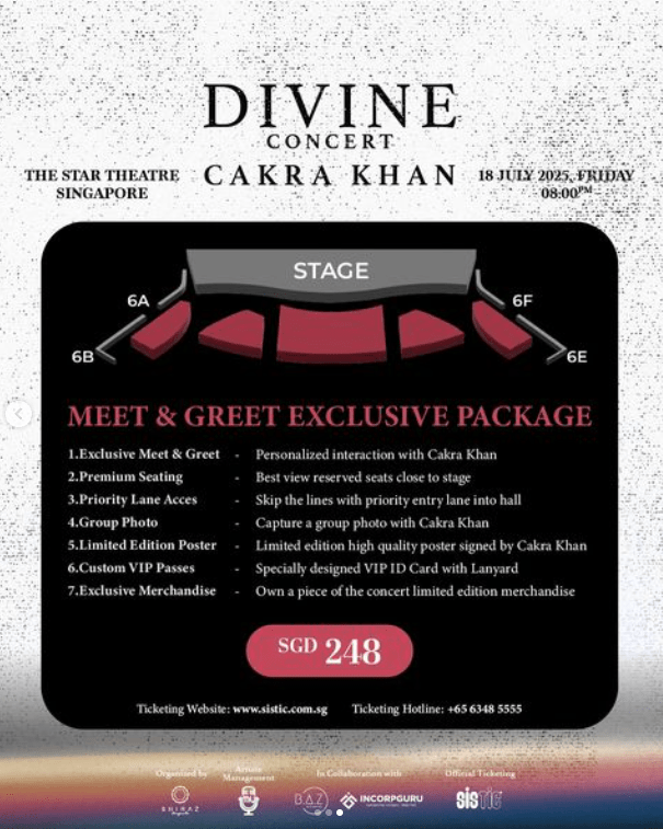 Berjudul Cakra Khan Divine Concert, persembahan istimewa ini akan berlangsung pada 18 Julai di Bukit Bintang Temasek (Star Theatre).