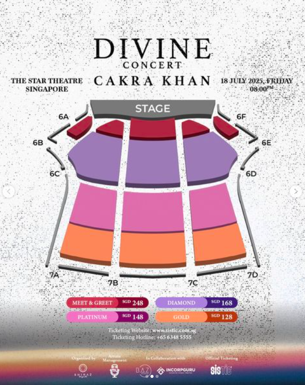 Berjudul Cakra Khan Divine Concert, persembahan istimewa ini akan berlangsung pada 18 Julai di Bukit Bintang Temasek (Star Theatre).