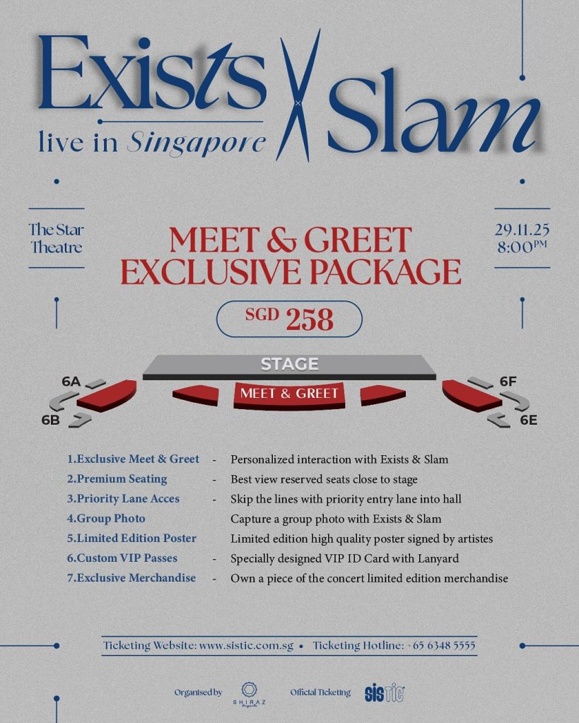 Lebih menarik, bagi peminat tegar Exists dan Slam, terdapat pakej “Meet & Greet” eksklusif yang menawarkan peluang bertemu dengan anggota kedua-dua band legenda ini secara lebih dekat. Pakej ini juga disertakan dengan poster bertandatangan, lanyard istimewa, merchandise eksklusif, dan pelbagai lagi keistimewaan lain!