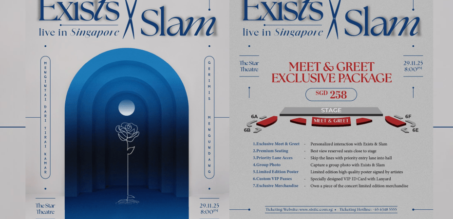 Lebih menarik, bagi peminat tegar Exists dan Slam, terdapat pakej “Meet & Greet” eksklusif yang menawarkan peluang bertemu dengan anggota kedua-dua band legenda ini secara lebih dekat. Pakej ini juga disertakan dengan poster bertandatangan, lanyard istimewa, merchandise eksklusif, dan pelbagai lagi keistimewaan lain!