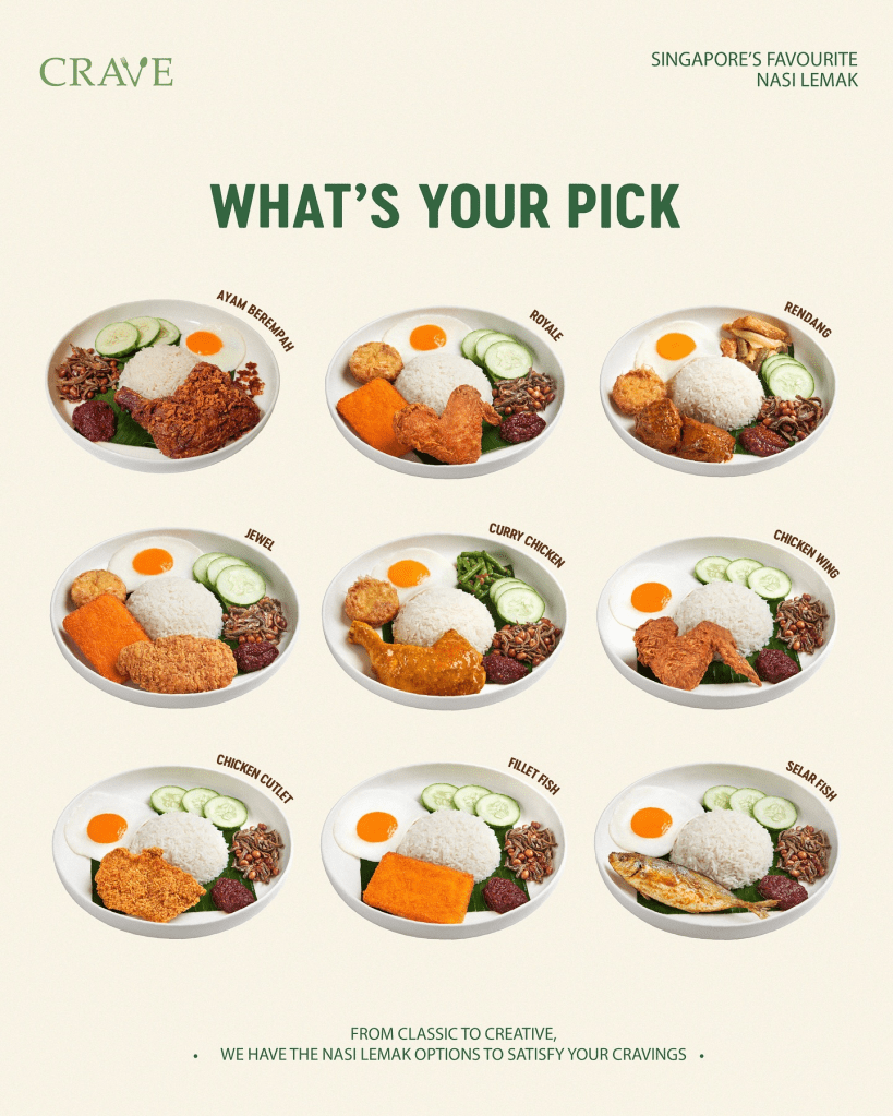 No halal list is complete without nasi lemak! Crave serves up this beloved local dish with premium touches. Top picks include:
