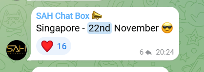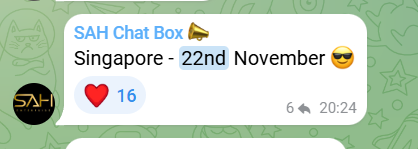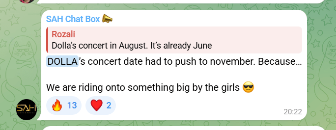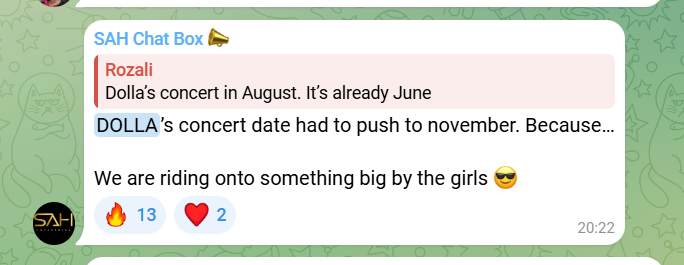 Itulah yang ditulis oleh SAH Entertainment mengenai status konsert Dolla di Singapura apabila peminat bertanya mengenai perkara itu di SAH Telegram Chat.