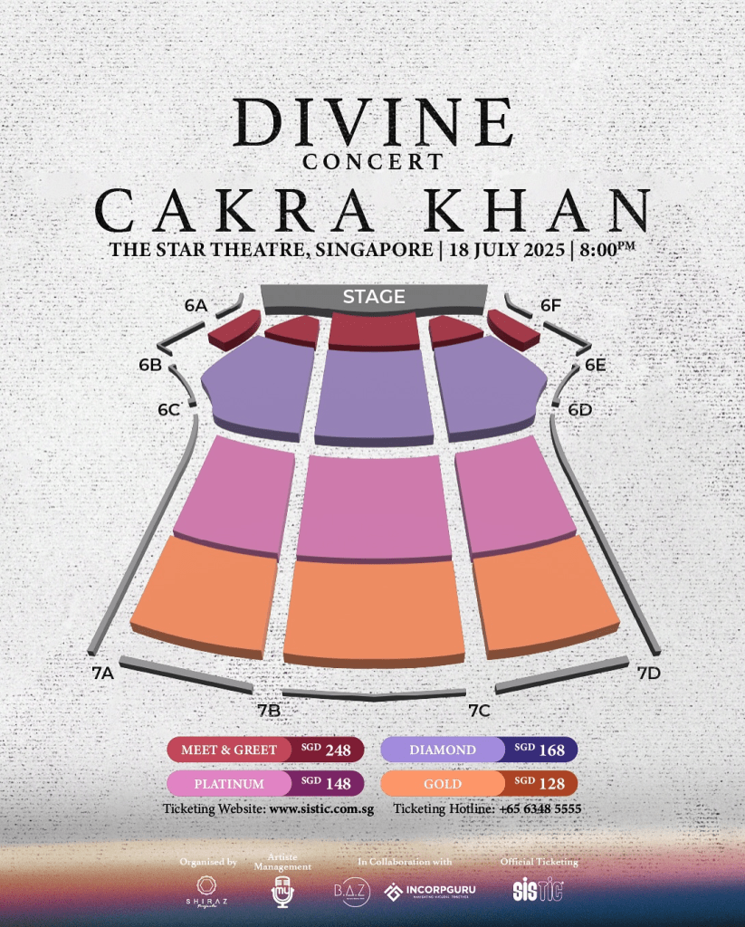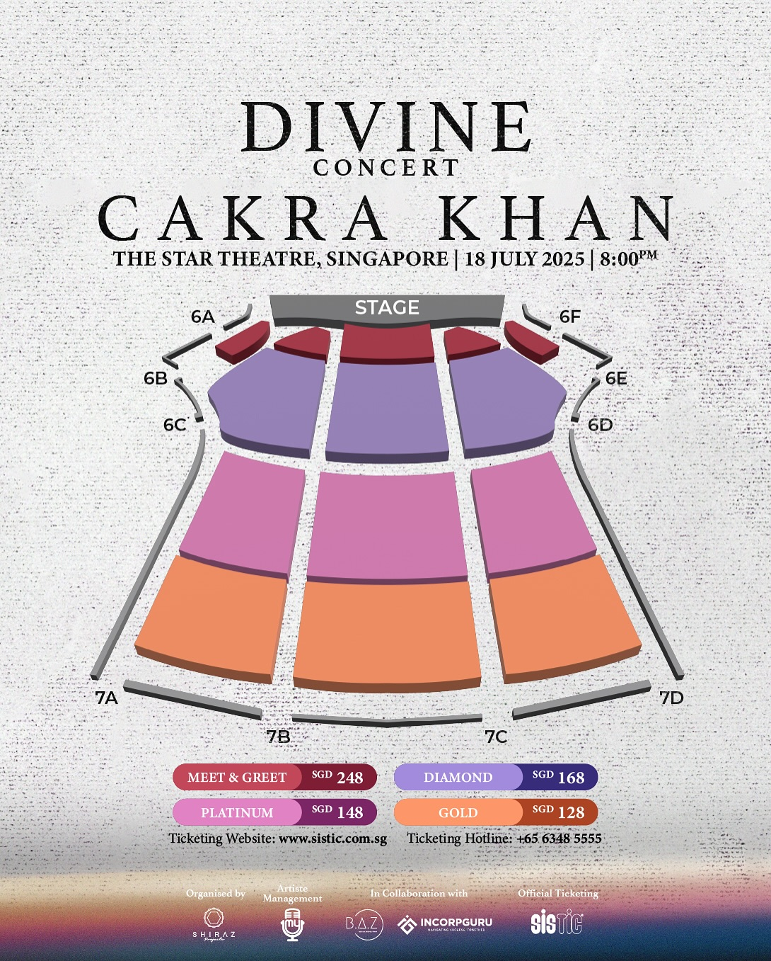 Selain menyaksikan Cakra Khan di Divine Concert yang bakal berlangsung pada 18 Julai di Bukit Bintang Temasek (Star Theatre), anda juga bakal dihiburkan oleh Ernie Zakri dan Ade Govinda.