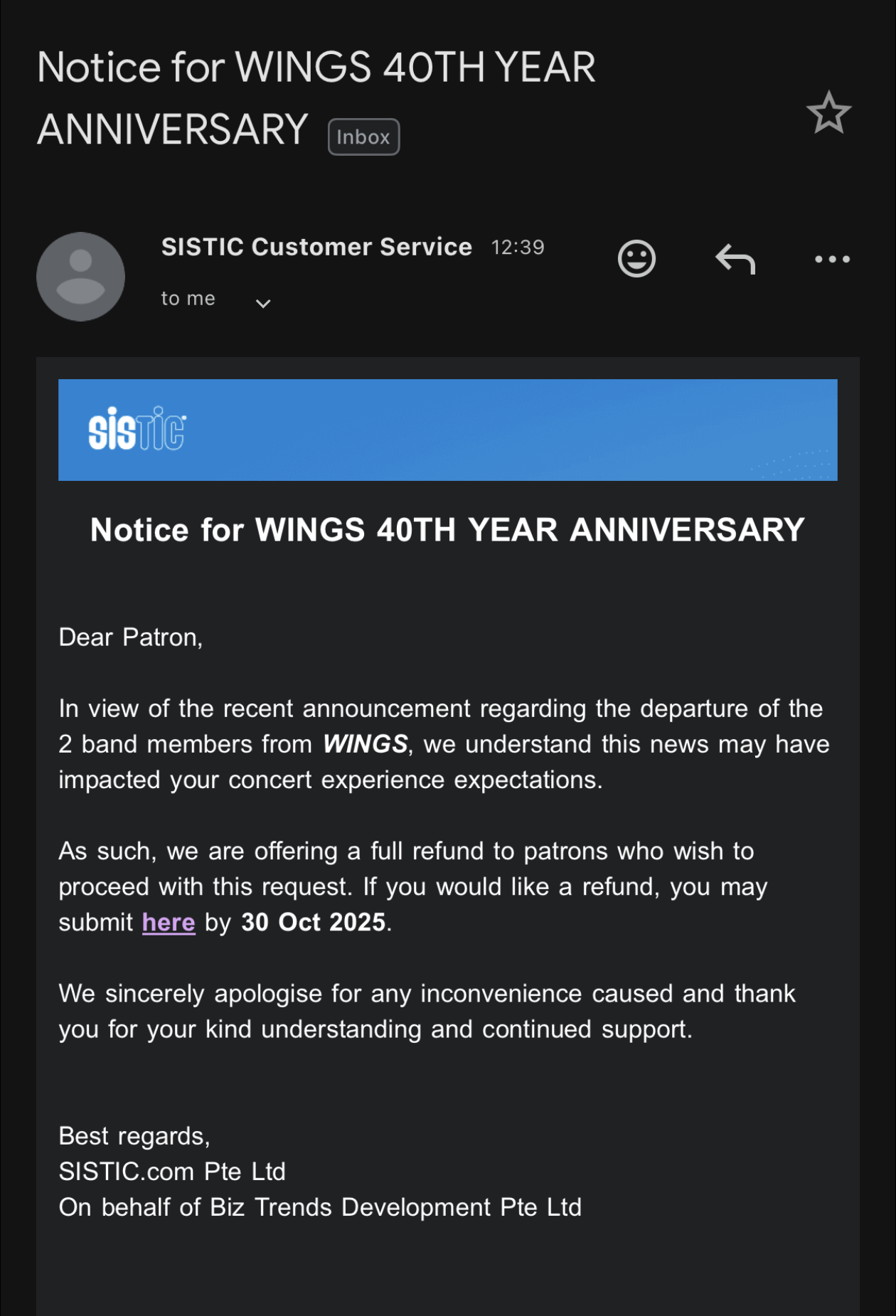 Berdasarkan e-mel yang dihantar oleh Sistic kepada pembeli tiket, mereka boleh mendapatkan pengembalian wang secara penuh sekiranya tidak lagi ingin menonton konsert akibat persaraan dua ahli ini.